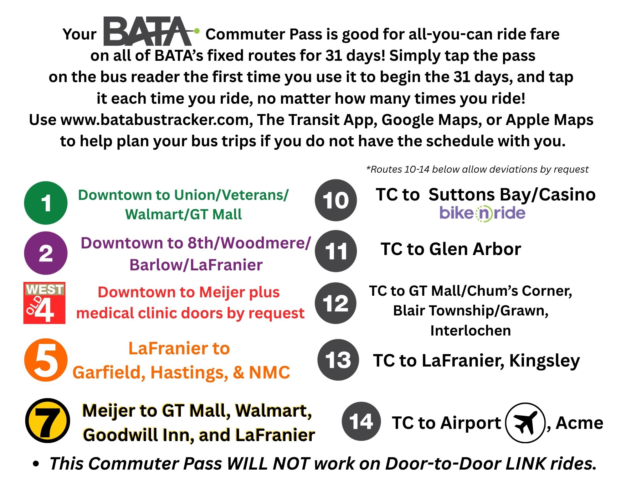 Make it a lunch date. Would you like to just "try" transit before you commit to a longer term relationship? Riders new or returning to BATA can visit the Traverse Area District Library's website to reserve your spot in line to check out a free BATA City and Village Loop 31-Day Commuter Pass. The library has a limited number of passes (3) to distribute each month and we appreciate your patience. Once you use the Commuter Pass, riders can refill the value of their card at Hall Street.