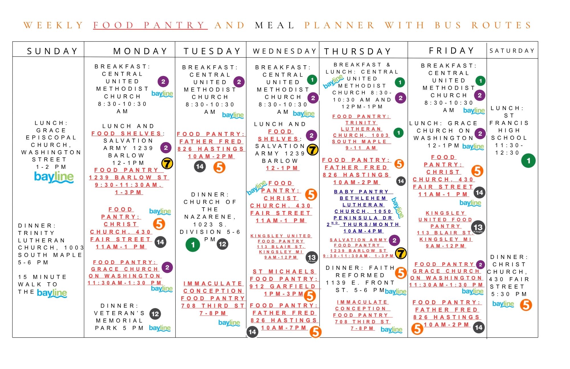 BATA is an affordable way to get where you need to go and clicking here gives a weekly calendar of food pantries and community meals along with the best BATA routes to use.