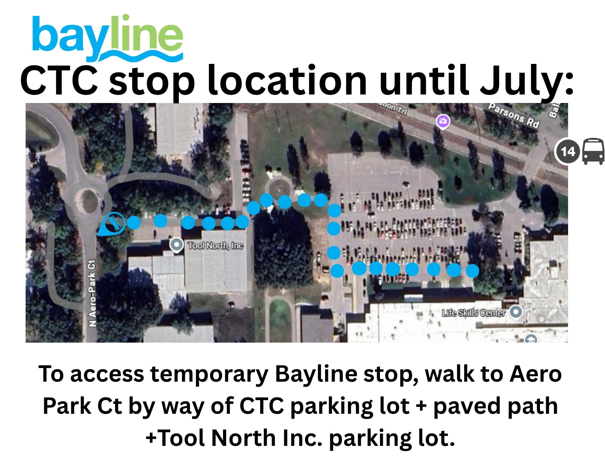 * Temporary CTC stop on Aero Park Ct. is accessible west of the CTC parking lot. See map on bottom of this page. Route 14 will serve the existing CTC shelter on its inbound to Hall St M-F ~7:50am, 9:50am, 11:50am, 2:50pm, & 4:50pm.