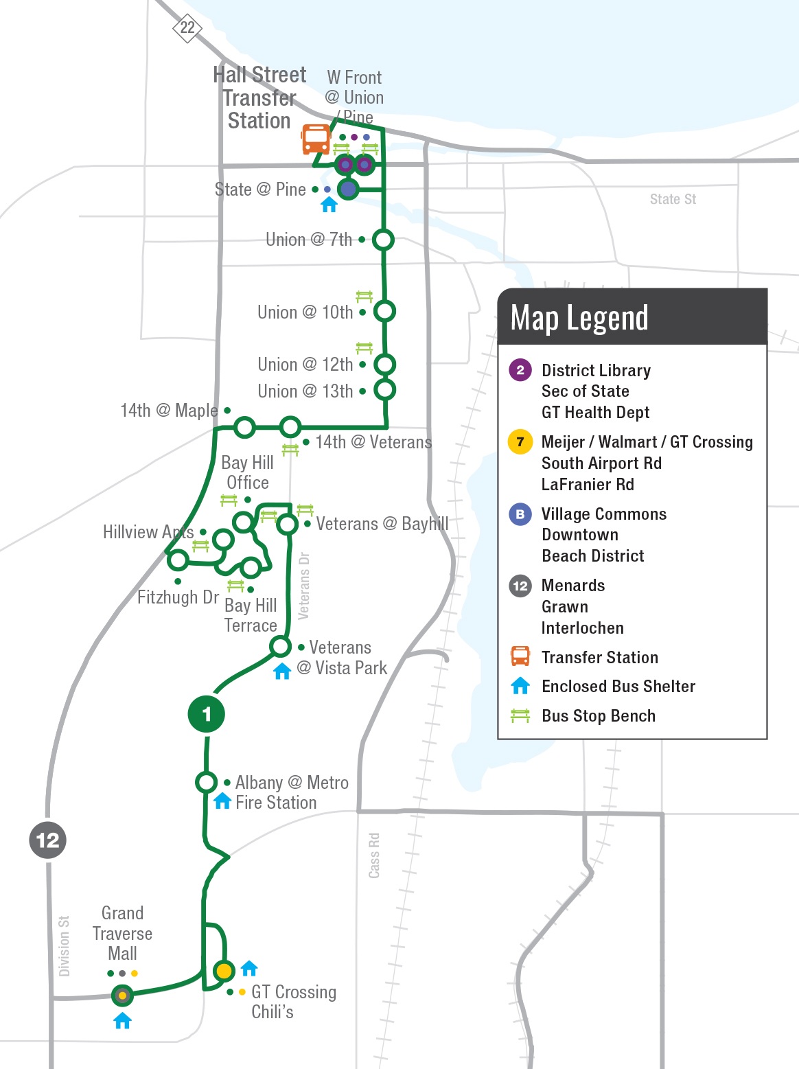 - Route 1: Downtown Traverse City to Veterans Rd & Grand Traverse Mall