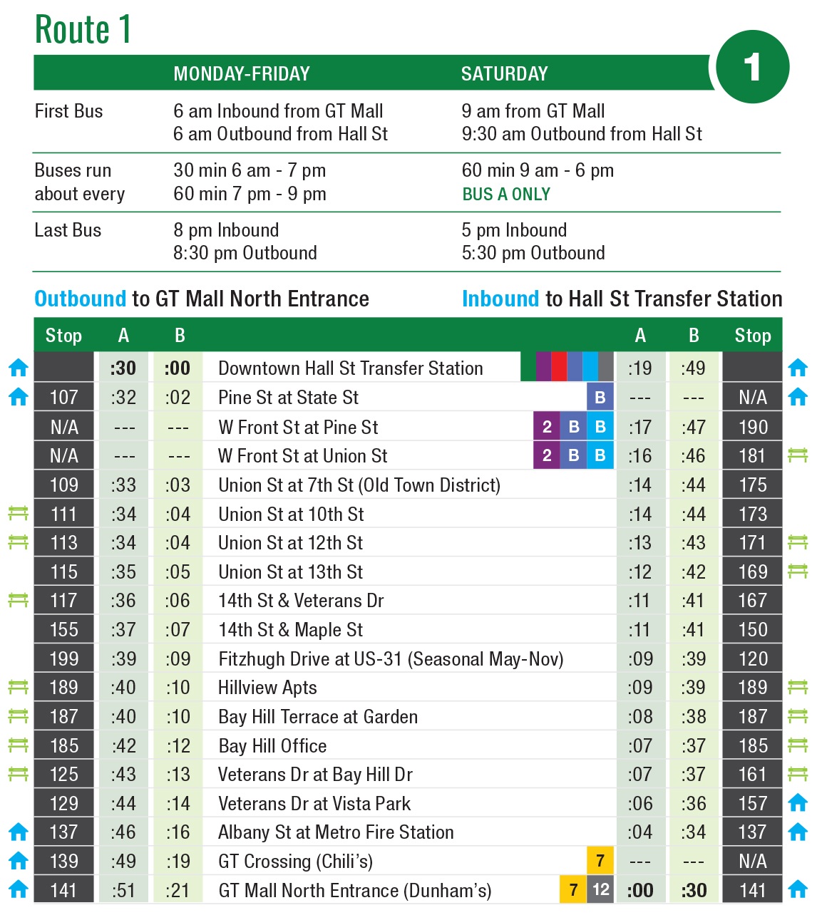* Route 1 now visits GT Crossings on the outbound times, but returns directly inbound from GT Mall without stopping again at GT Crossings. Route 7 will visit both GT Mall and GT Crossings in both directions.