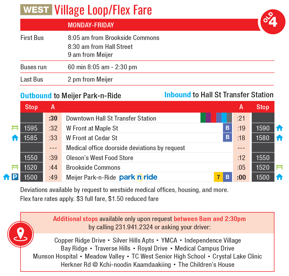 OLD Route 4, WEST FLEX: Buses every hour from 8:30am to 2:30pm Monday-Friday. Flex fare applies, deviations by request.