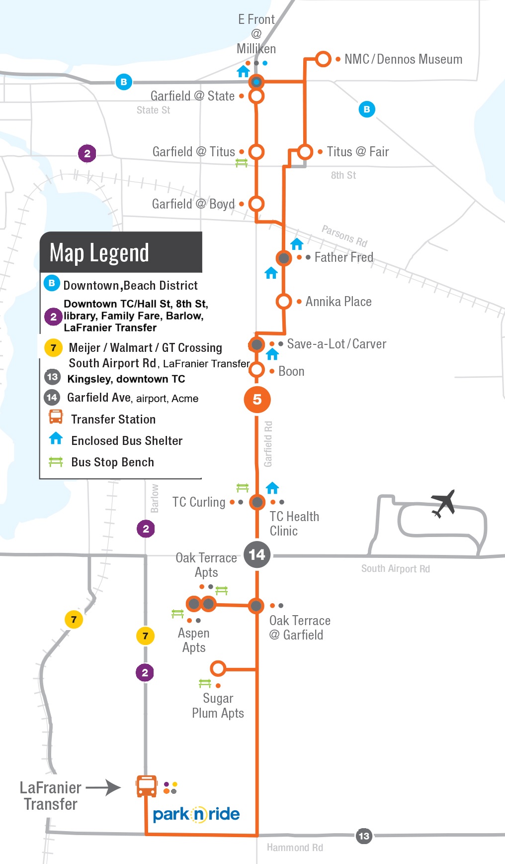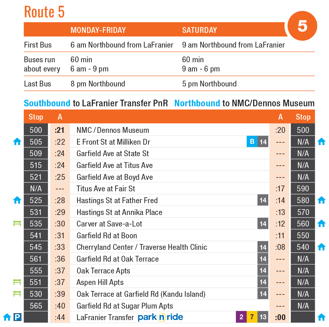 - Route 5: LaFranier Park-n-Ride to Garfield/Hastings & NMC