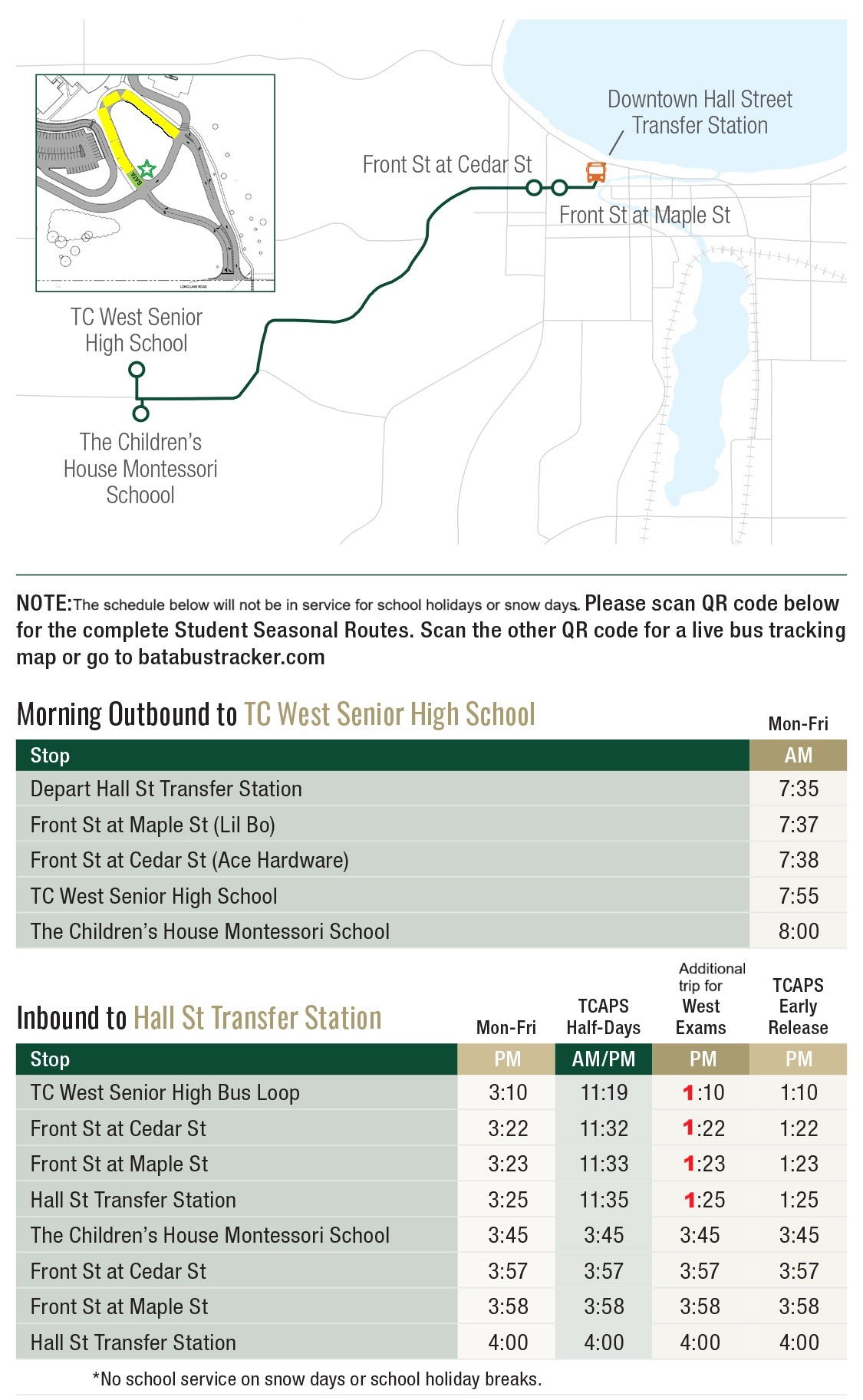 BATA's WEST Route runs between downtown Traverse City and Traverse City West Senior High School plus the Children's House Montessori School each morning to school and each day from school, including TCAPS early release, half days, and exam dates.