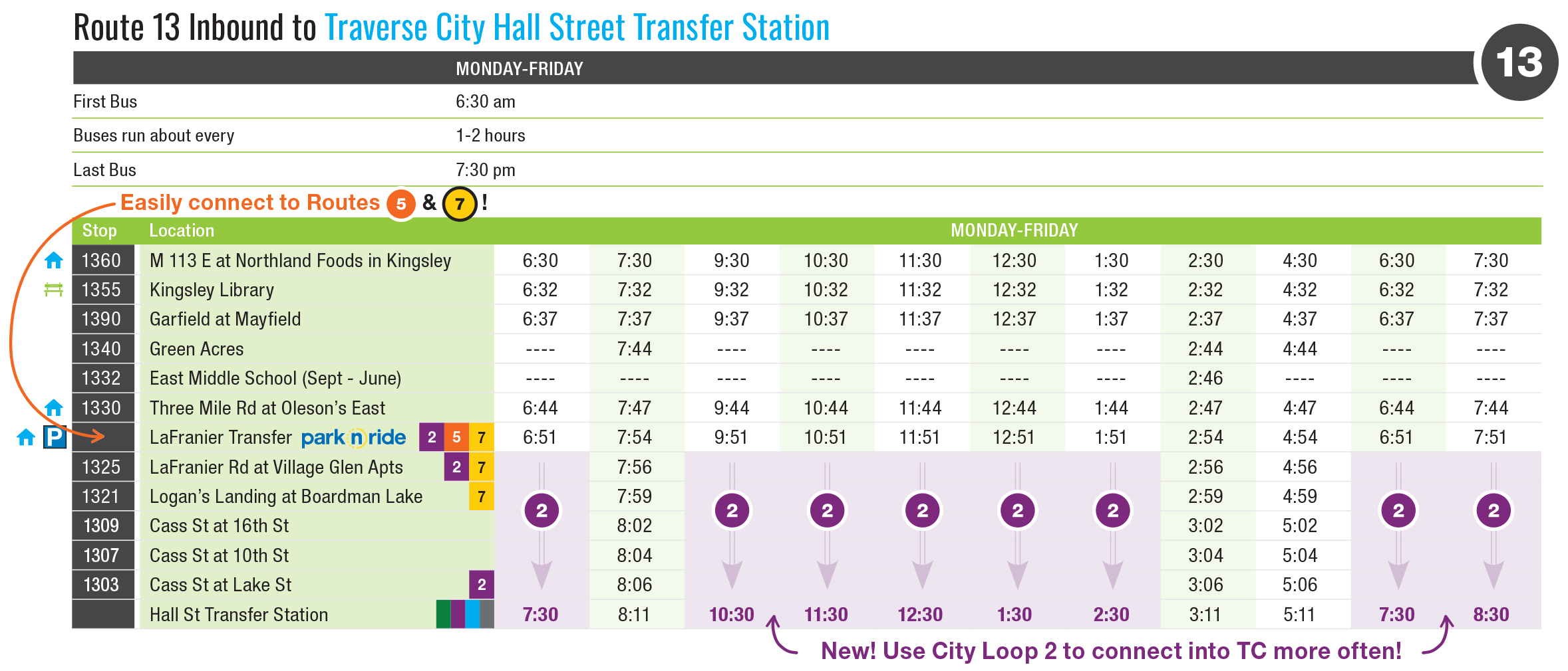 Route 13 - Traverse City to Kingsley, Monday - Friday. Buses almost every hour between LaFranier park-n-Ride and Kingsley except for AM and PM peak travel periods when Route 13 travels all the way to downtown Traverse City/Hall St.