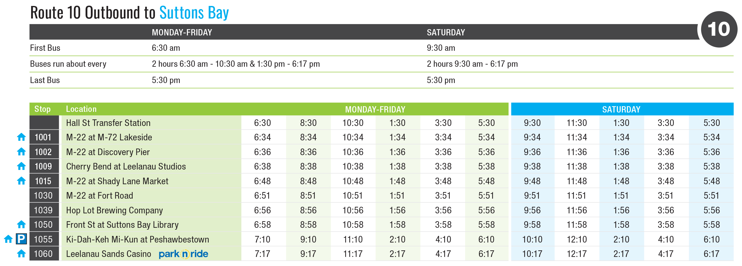 Route 10: Traverse City to Suttons Bay. Buses every two hours Monday - Saturday.