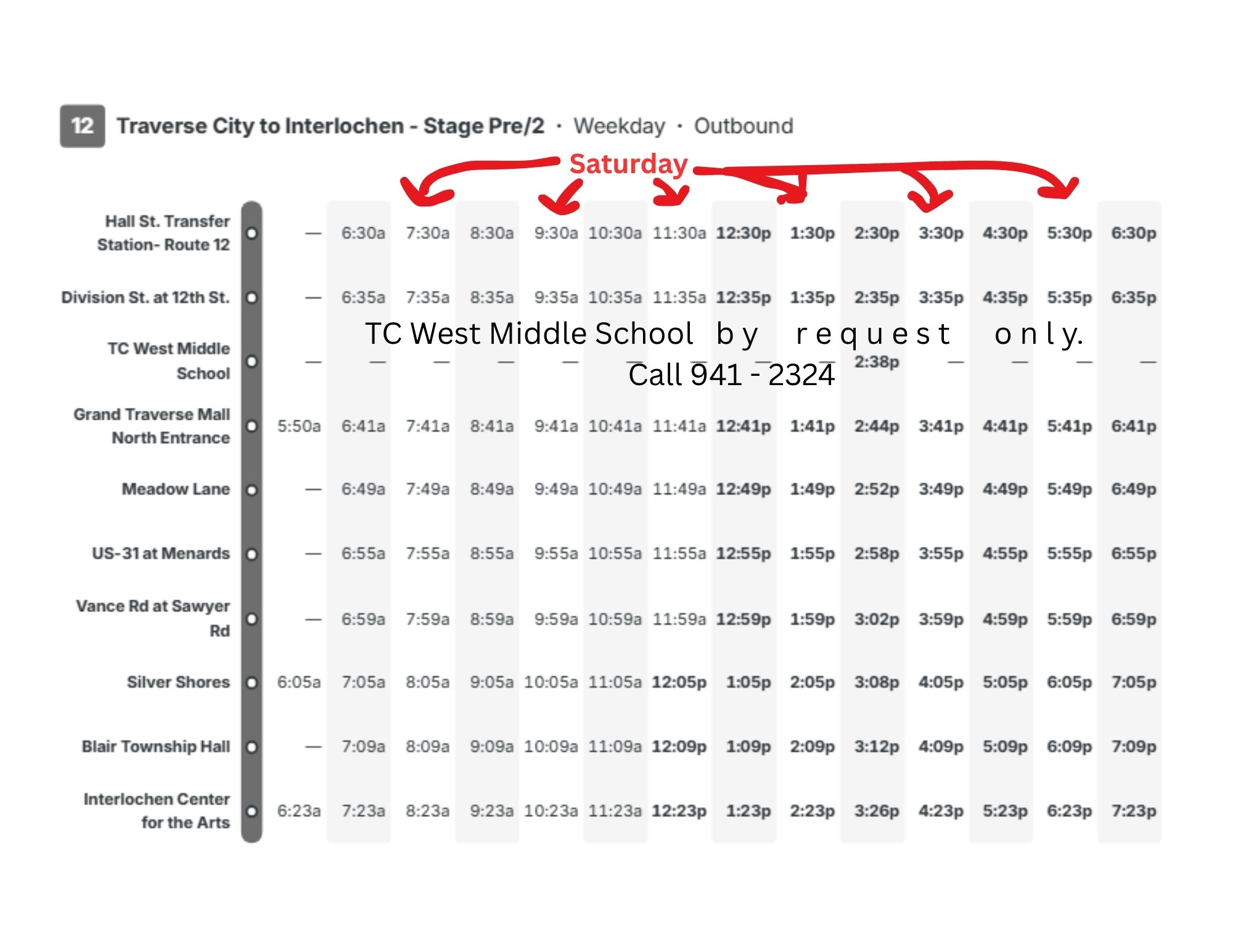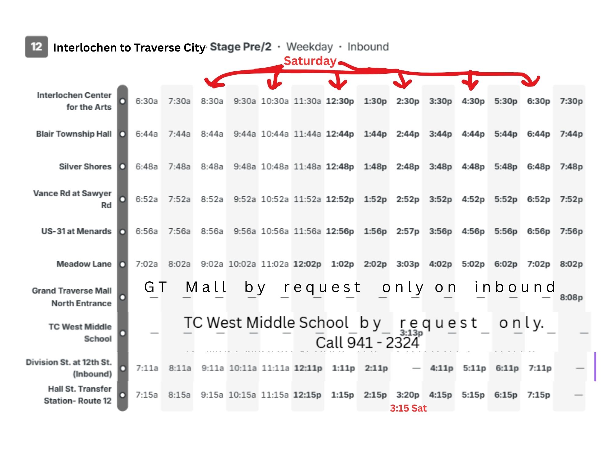 Route 12 - Traverse City to GT Mall, Chum's Corner, Blair, & Interlochen. Buses every hour Monday - Friday and every two hours on Saturday.