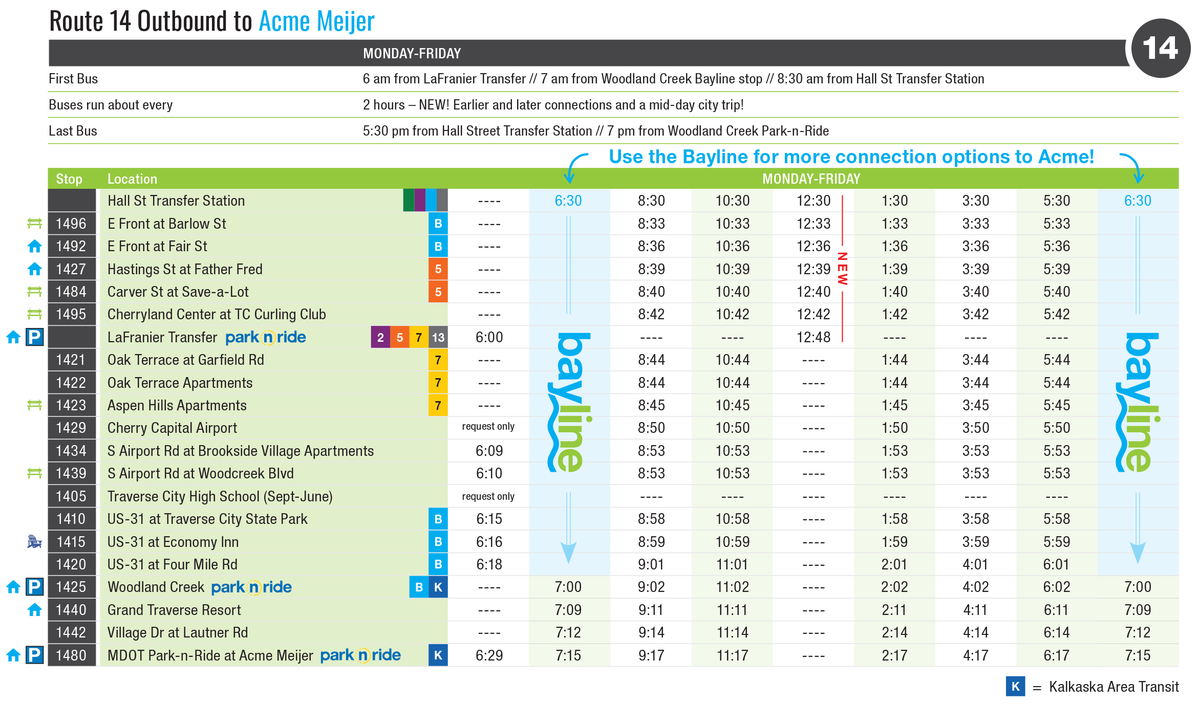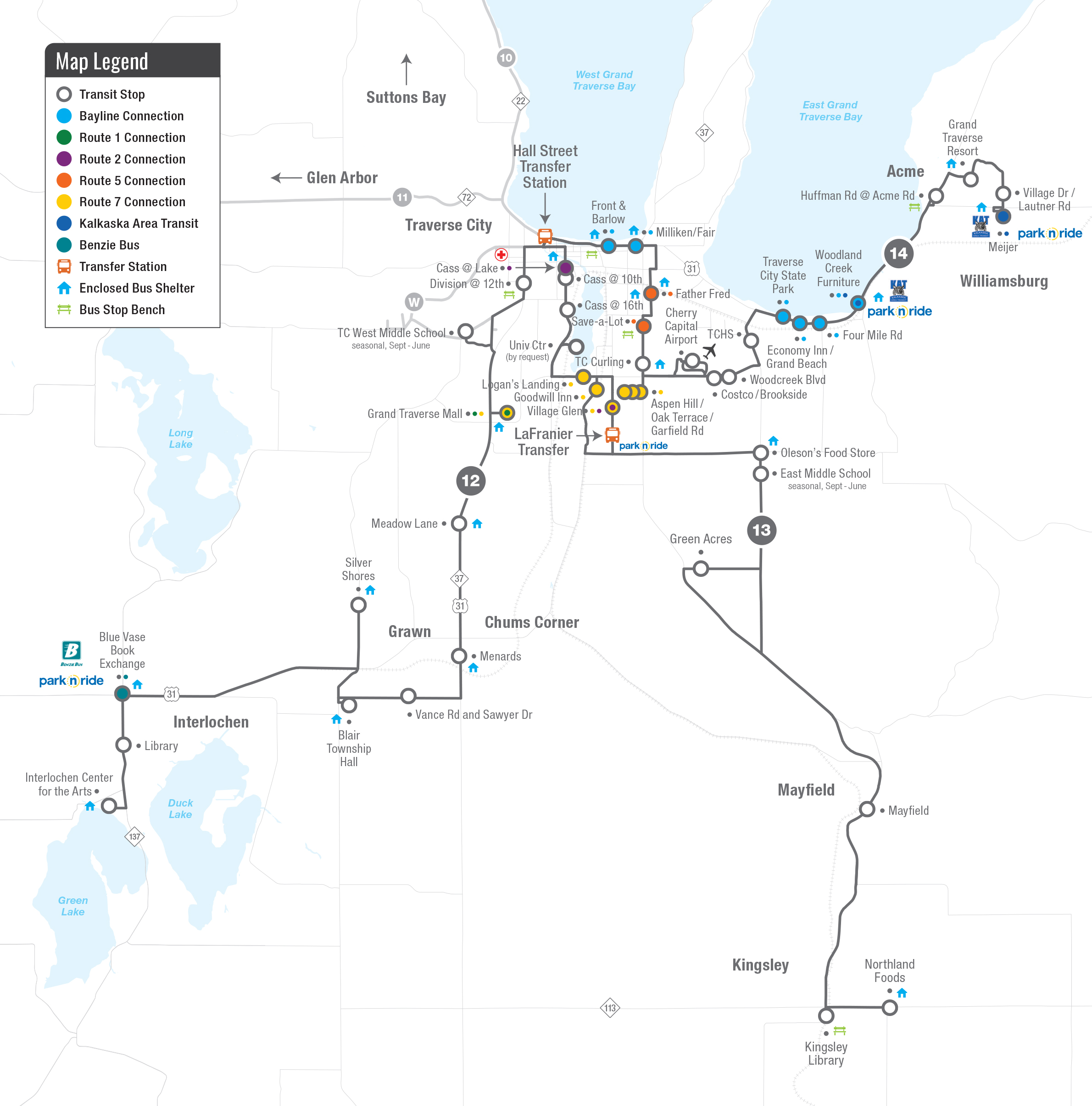 Route 14 - Traverse City to Cherry Capital Airport, beach hotels, and Acme. Buses every two hours, except for an hourly mid-day service in town.