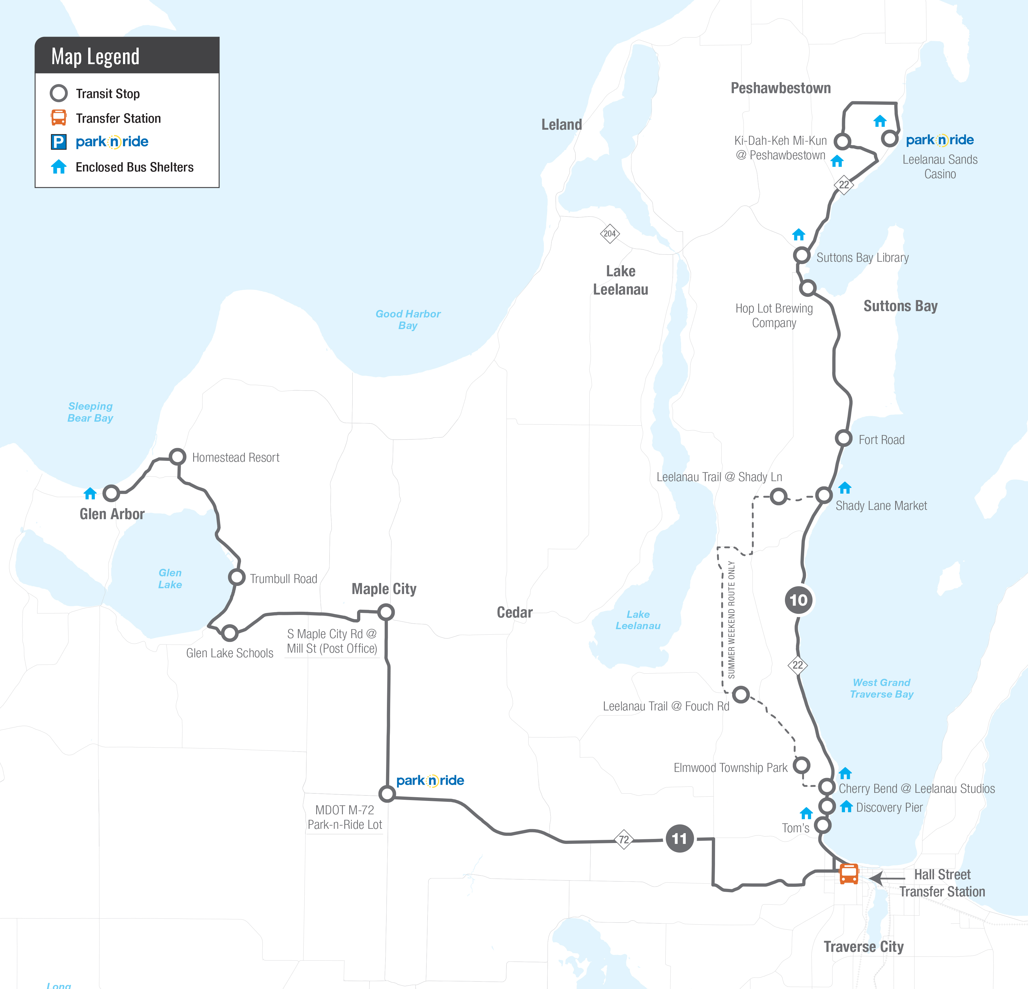 Route 11 - Traverse City to Glen Arbor. Two trips a day, Monday - Friday.